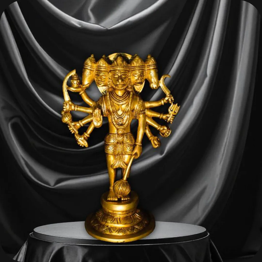 Panchmukhi Hanuman is a powerful manifestation of Hanuman with five faces symbolizing protection in all directions and victory over evil forces. This brass murti represents strength, devotion, and divine protection.