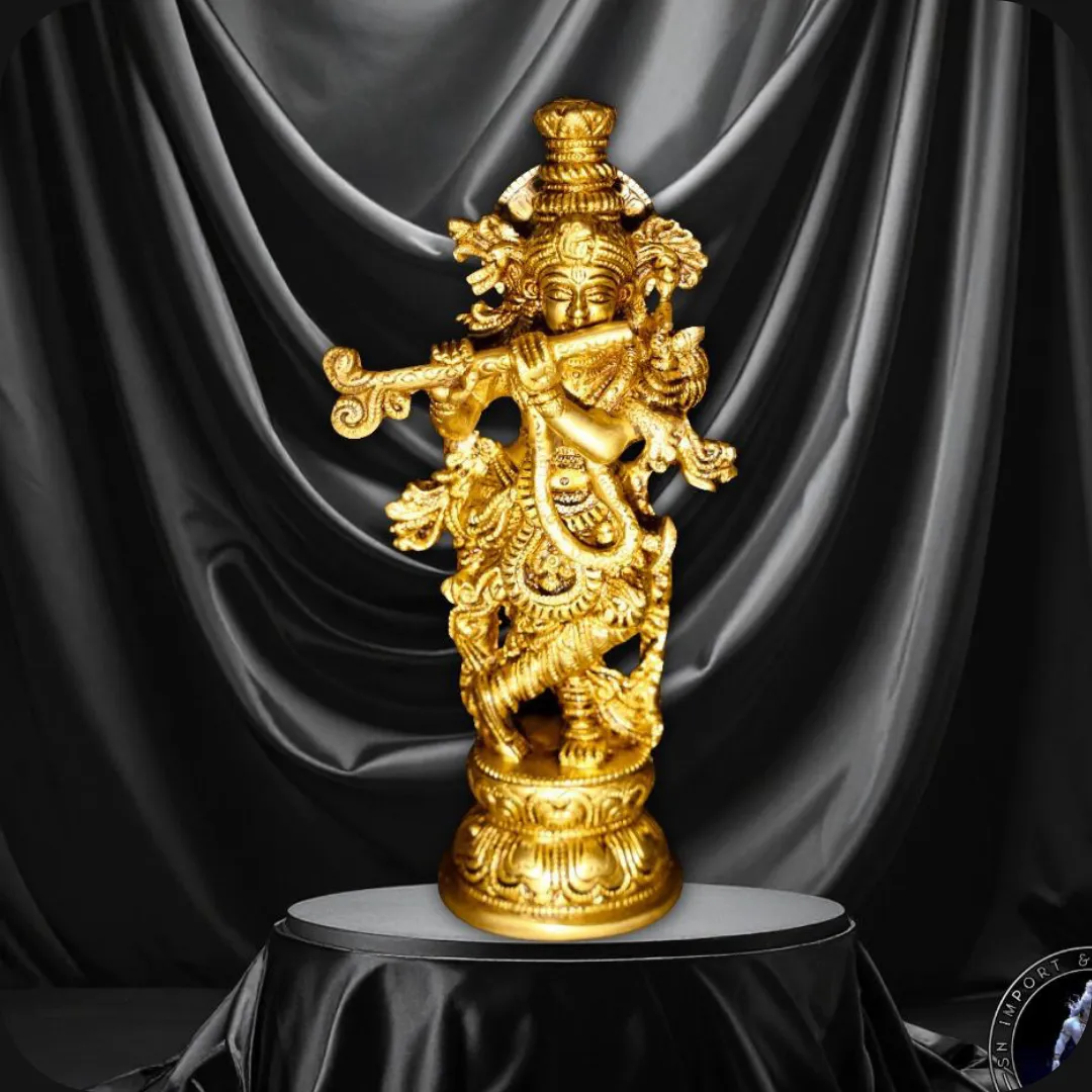 Krishna, the divine incarnation of Vishnu, is revered for love, wisdom, and compassion as described in the Bhagavad Gita. This brass murti symbolizes devotion, joy, and spiritual guidance.