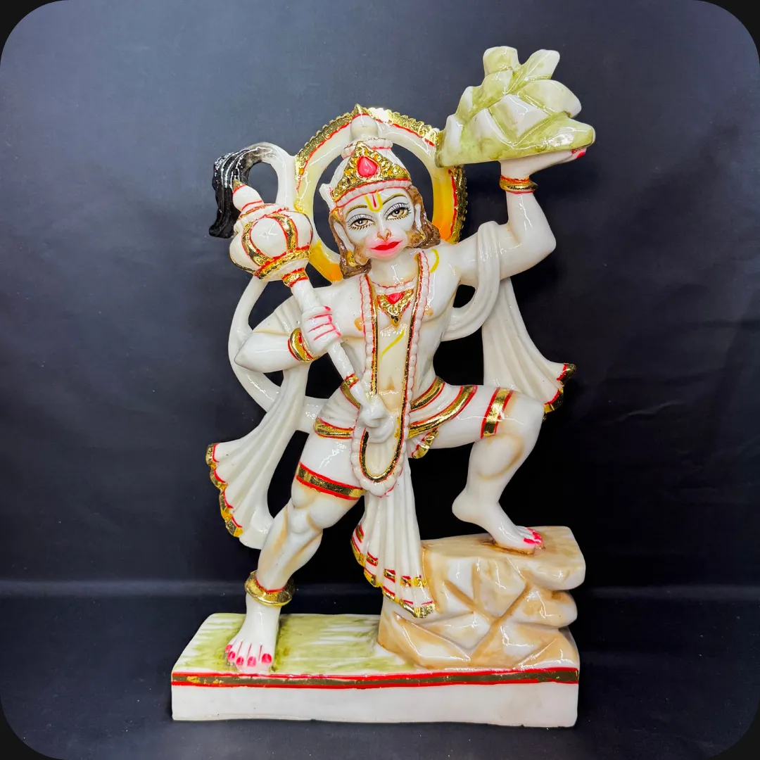 Hanuman carrying the Sanjeevani mountain symbolizes devotion, strength, and divine service to Lord Rama. This marble dust murti represents courage, protection, and unwavering faith in Hindu tradition.