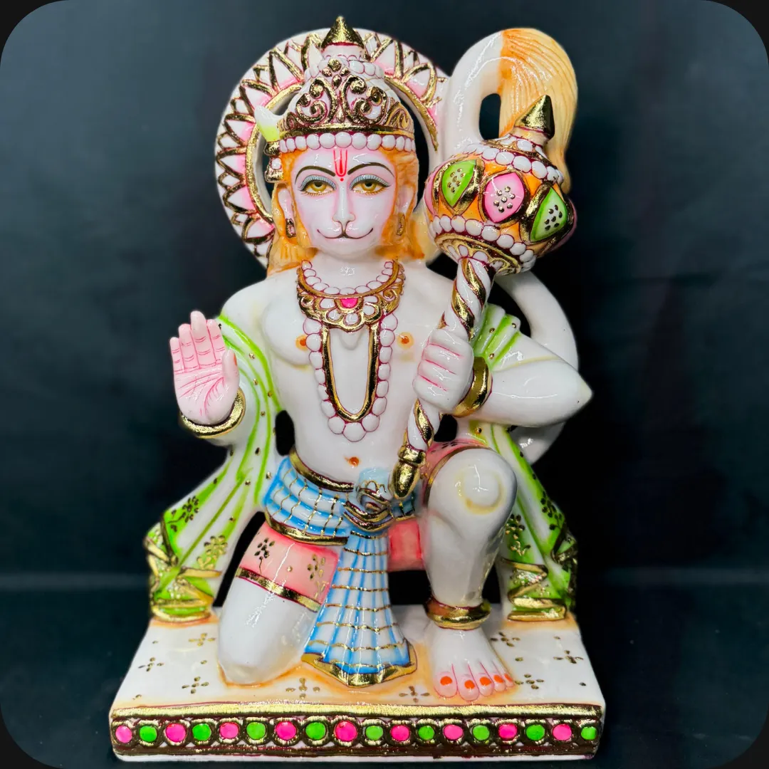 Hanuman in the kneeling posture symbolizes humility, devotion, and eternal service to Rama as described in the epic Ramayana. This marble dust murti represents loyalty, strength, and deep devotion.